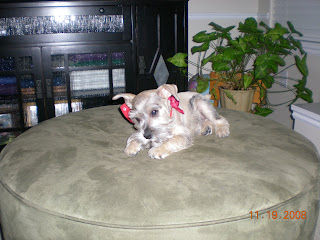When Honda had her puppies, we were really hoping that she would have a white one (we bred her with a white schnauzer). Rancho is the runt of the litter and the lightest of all the puppies, so we decided to keep him. The vet told us he would probably be a very light silver color. Well, he got his first official schnauzer cut yesterday and he is almost white - dirty white. He blends in with the carpet really well, because he still has a few speaks of dark gray. He looks like a completely different dog. And by getting rid of all the puppy fur - he is now so soft and silky. Donna, the groomer, apologized because she thought he looked wierd. She said she has never seen a schnazer that is SO brown. Depending on the light, he is almost a champagne color.